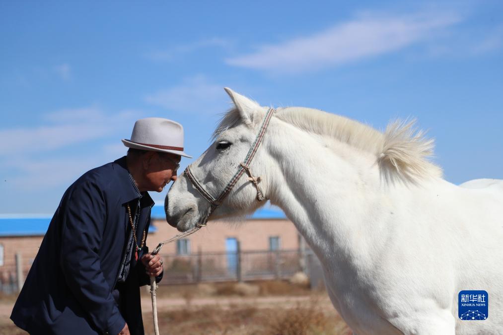 10月16日,明安寶低頭親吻自家的馬匹。
