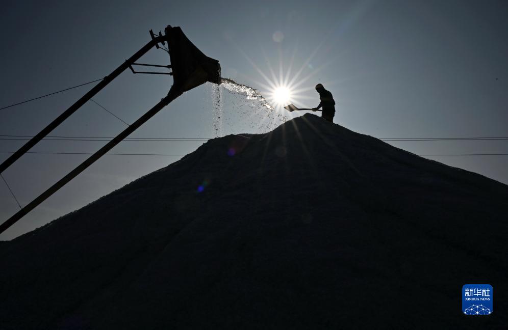10月14日,工人在河北省灤南縣嘴東經(jīng)濟開(kāi)發(fā)區鹽場(chǎng)收獲秋鹽。