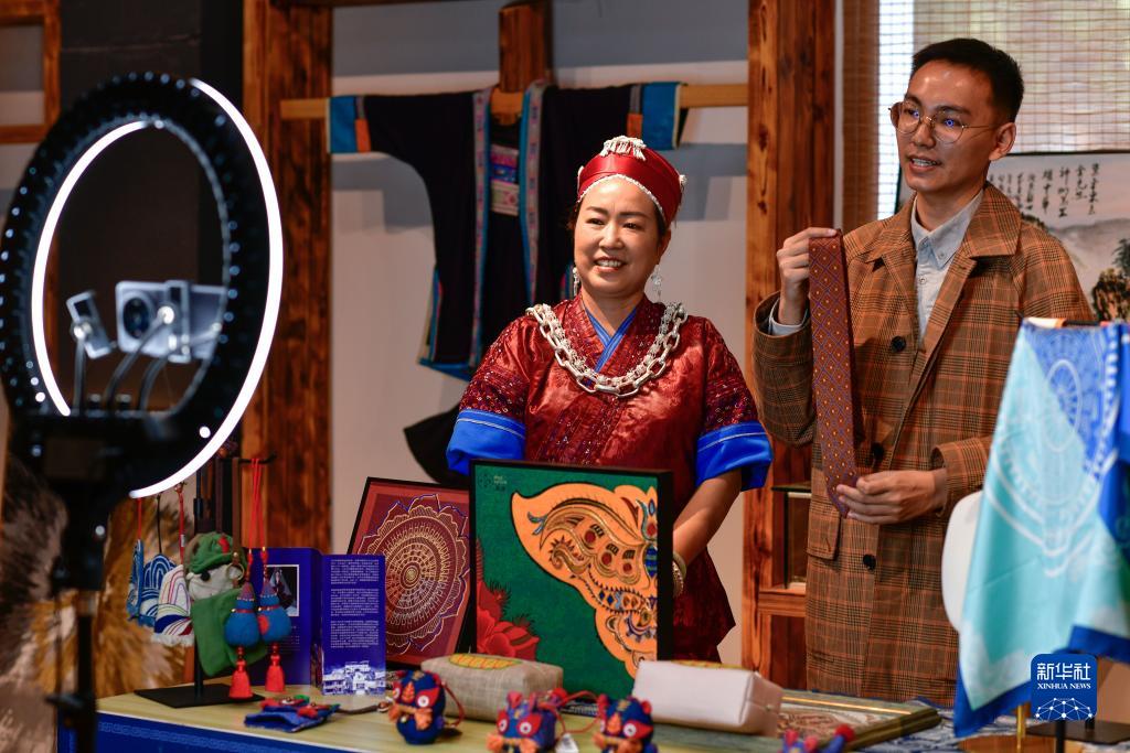 龍祿穎與兒子在公司的鄉村振興直播間推介苗繡文創(chuàng )產(chǎn)品(10月18日攝)。