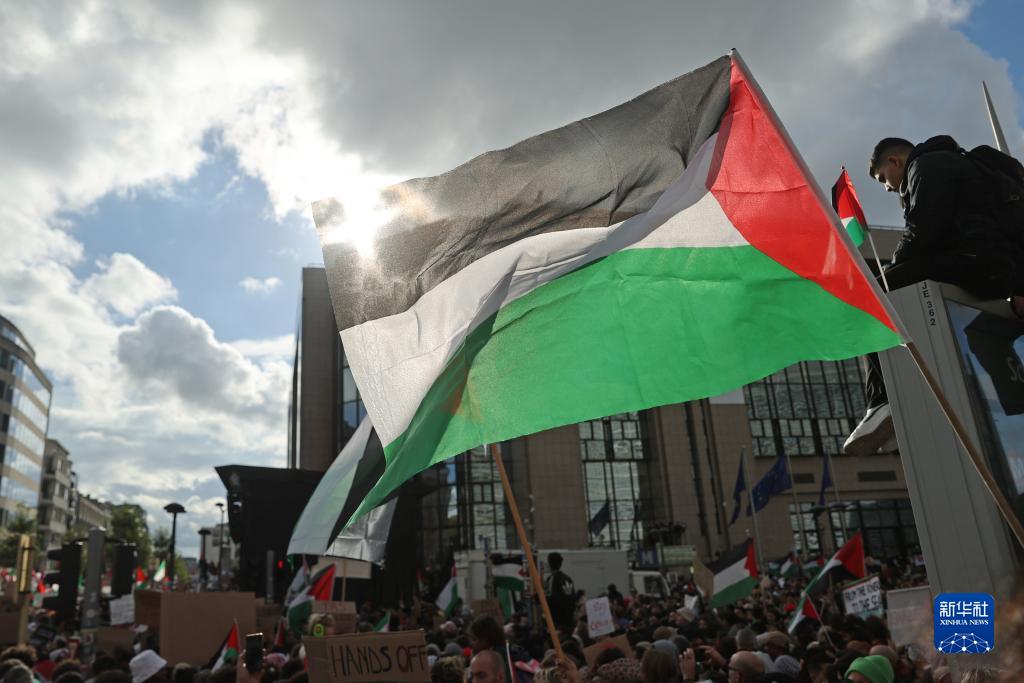 當日,眾多巴勒斯坦支持者在位于比利時(shí)布魯塞爾的歐盟總部附近舉行集會(huì ),聲援巴勒斯坦。