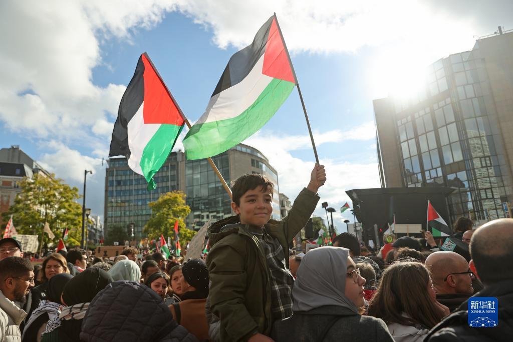 當日,眾多巴勒斯坦支持者在位于比利時(shí)布魯塞爾的歐盟總部附近舉行集會(huì ),聲援巴勒斯坦。