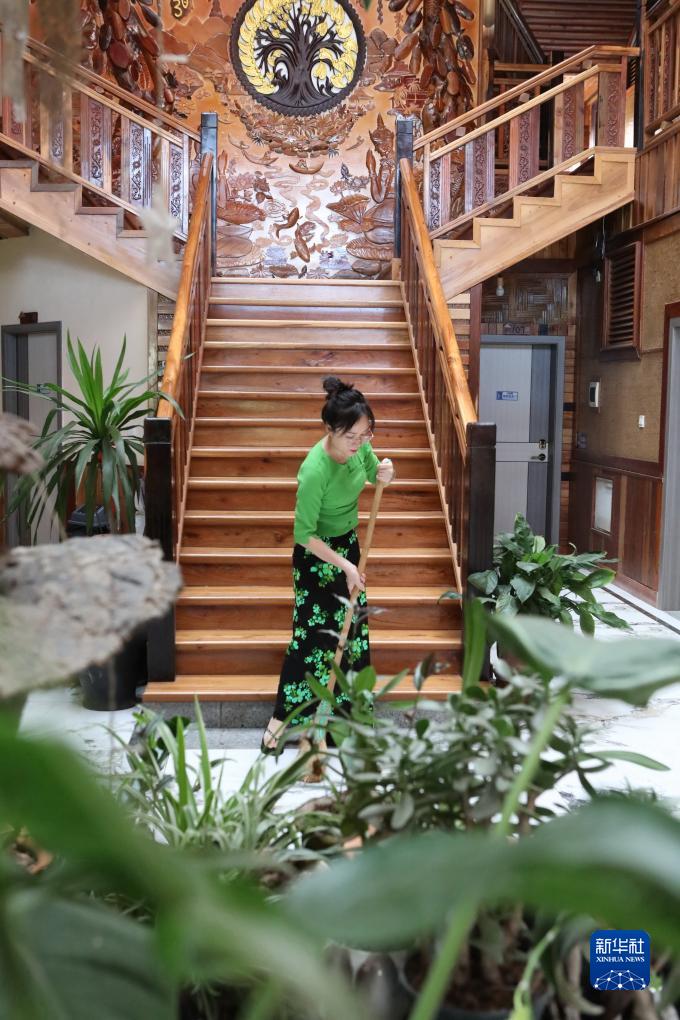 10月18日,云南省景洪市勐罕鎮曼聽(tīng)村傣族姑娘玉叫囡在自家客棧打掃衛生。