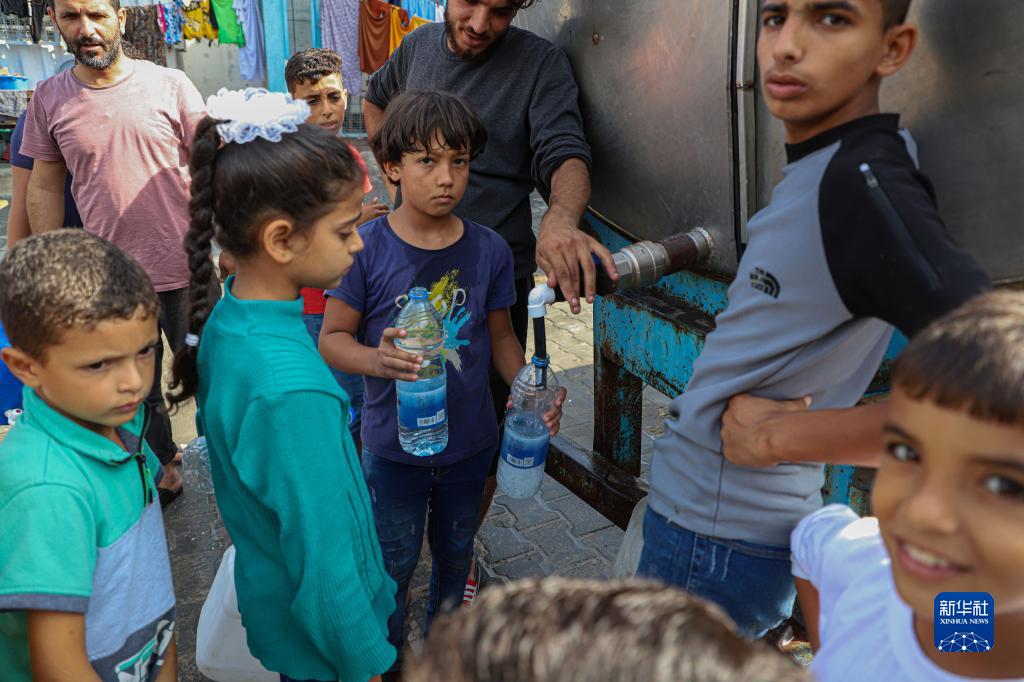10月22日,兒童在加沙地帶南部城市汗尤尼斯一所臨時(shí)收容學(xué)校內取水。