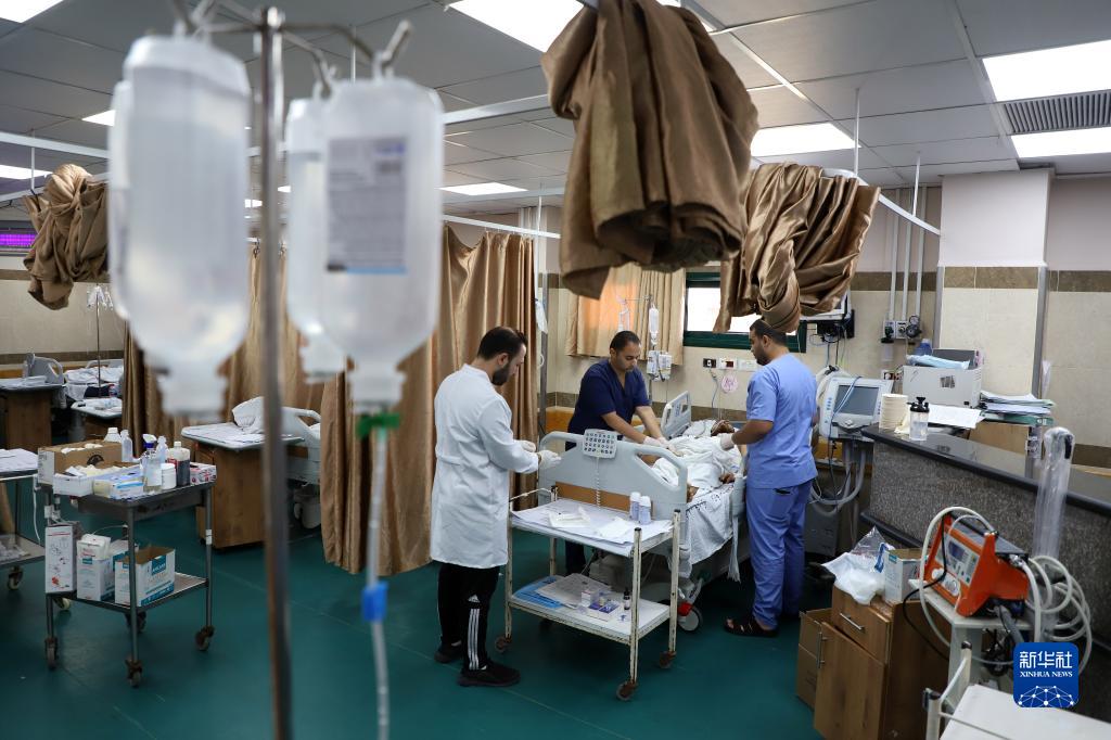 10月22日,在加沙地帶南部城市汗尤尼斯的納賽爾醫院,醫務(wù)人員救治在以色列空襲中受傷的巴勒斯坦人。