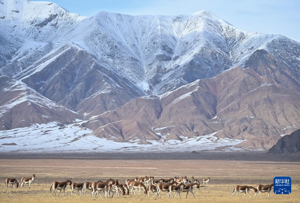 10月16日,在阿爾金山國家級自然保護區,藏野驢在草原上覓食。
