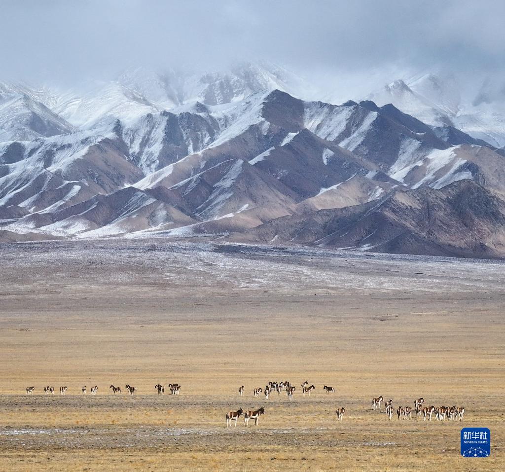 10月16日,在阿爾金山國家級自然保護區,藏野驢在草原上覓食(無(wú)人機照片)。