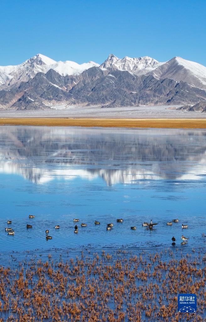 10月18日,在阿爾金山國家級自然保護區,針尾鴨等水鳥(niǎo)在依協(xié)克帕提湖棲息(無(wú)人機照片)。