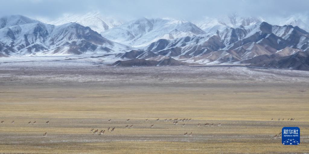 10月16日,在阿爾金山國家級自然保護區,藏野驢在草原上覓食(無(wú)人機照片)。