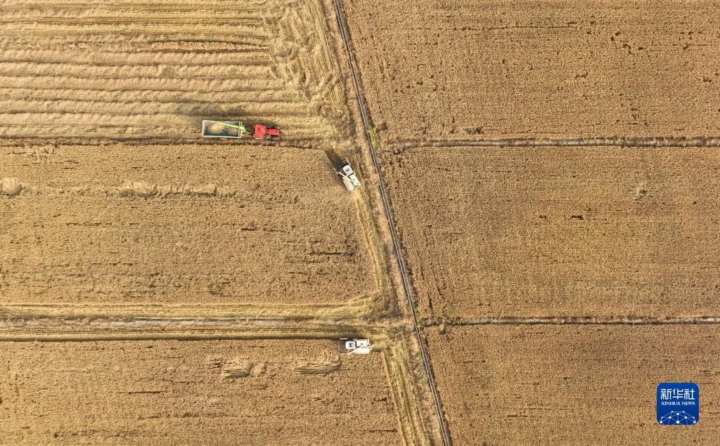 10月23日,水稻收割機在彰武縣大冷鎮上三家子村的稻田中收割水稻(無(wú)人機照片)。