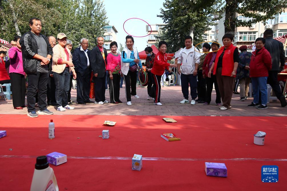 10月23日,在山東省濟南市洪家樓街道洪樓廣場(chǎng)社區,老年人在參加套圈游戲。