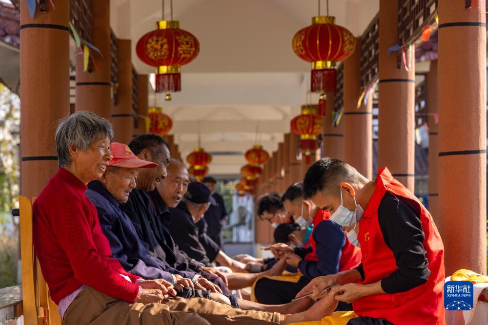 10月23日,志愿者在江蘇泰州市海陵區九龍敬老院為老人修腳。