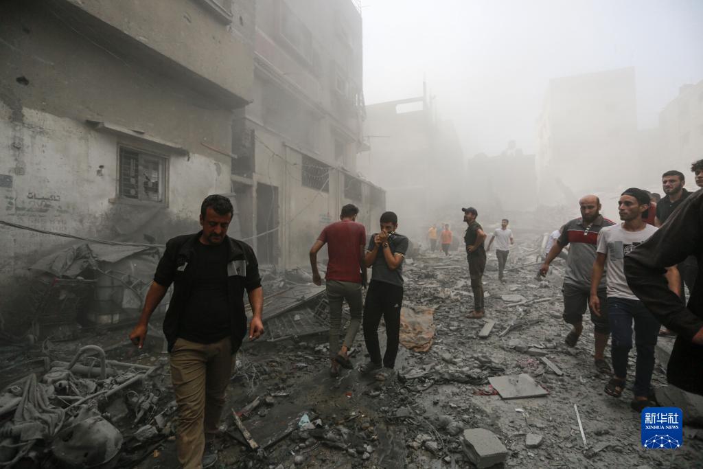 10月23日,人們在加沙城查看空襲后的受損建筑。