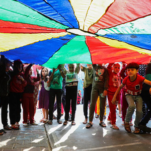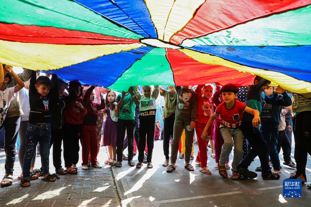 10月23日,在加沙地帶南部,流離失所的兒童在聯(lián)合國近東巴勒斯坦難民救濟和工程處一所附屬學(xué)校內做游戲。