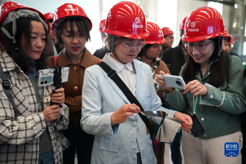 10月24日,參觀(guān)者在中國寶武山西太鋼不銹鋼精密帶鋼有限公司車(chē)間展示“手撕鋼”。