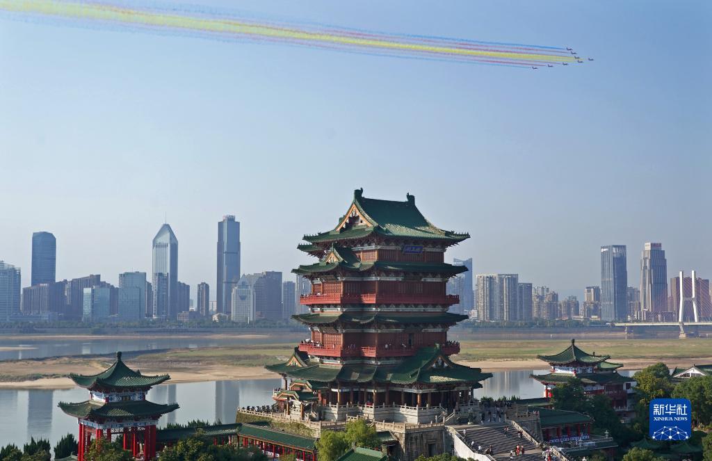 10月24日,空軍航空大學(xué)“紅鷹”飛行表演隊在南昌滕王閣景區上空進(jìn)行飛行表演。
