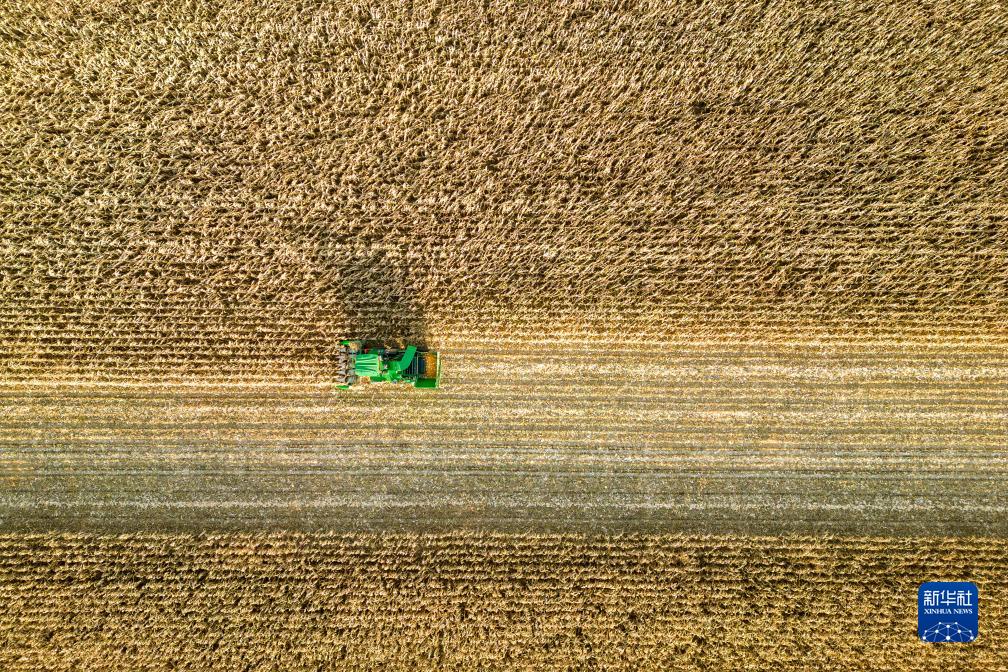 10月19日,收割機在齊齊哈爾市甘南縣中興鄉綠化村的一處玉米地收獲玉米(無(wú)人機照片)。