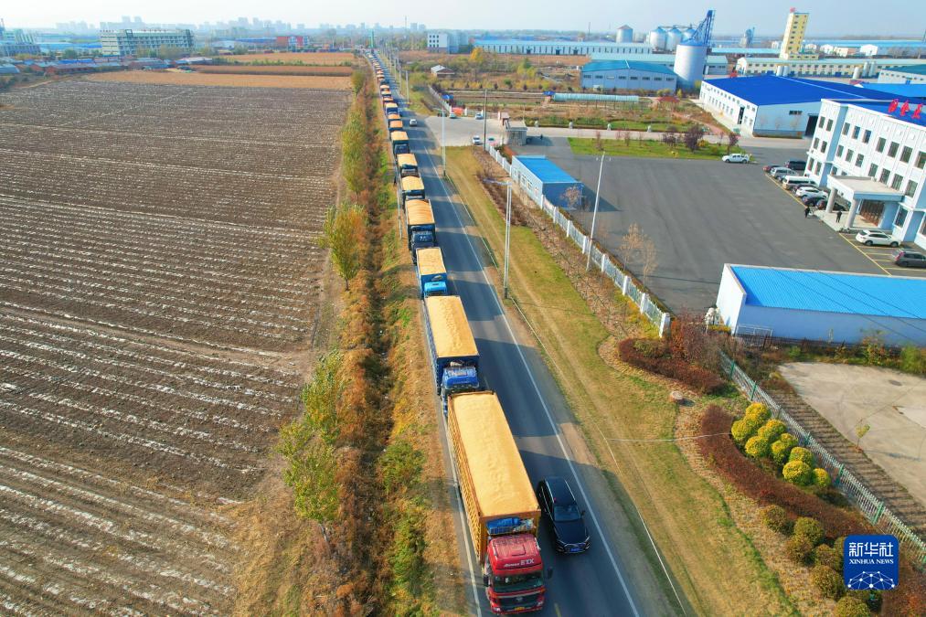 10月24日,送糧車(chē)在黑龍江省富錦市一大型糧食倉儲加工企業(yè)外排起長(cháng)隊(無(wú)人機照片)。