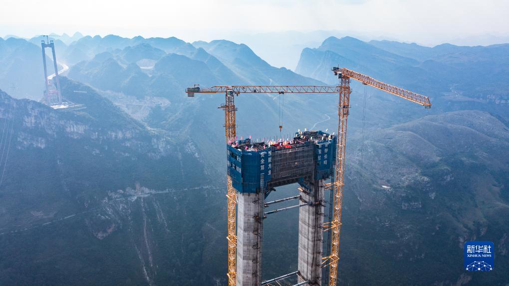 10月24日拍攝的六安高速花江峽谷大橋5號主塔(無(wú)人機照片)。