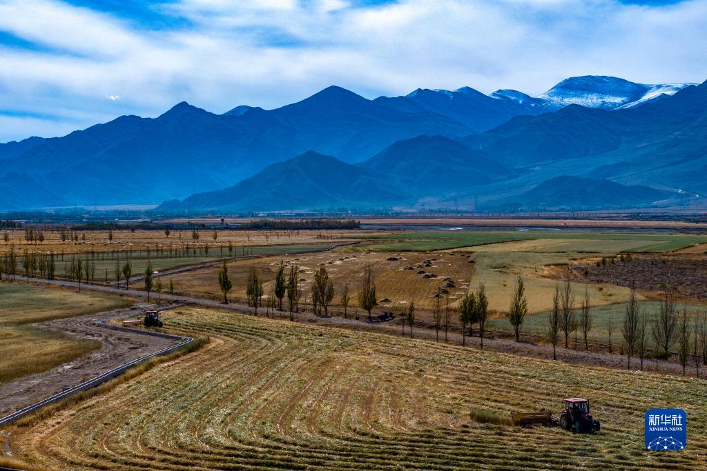 10月24日,村民駕駛農機在拉薩市林周縣強嘎鄉曲嘎強村收割牧草(無(wú)人機照片)。
