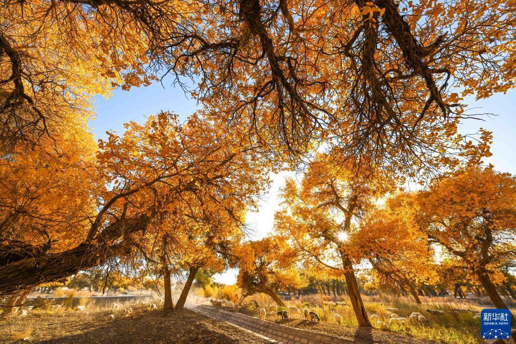 10月24日,羊群在胡楊林里覓食。