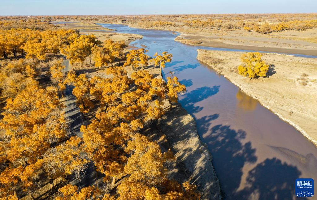 這是黑河岸邊的胡楊林(10月24日攝,無(wú)人機照片)。