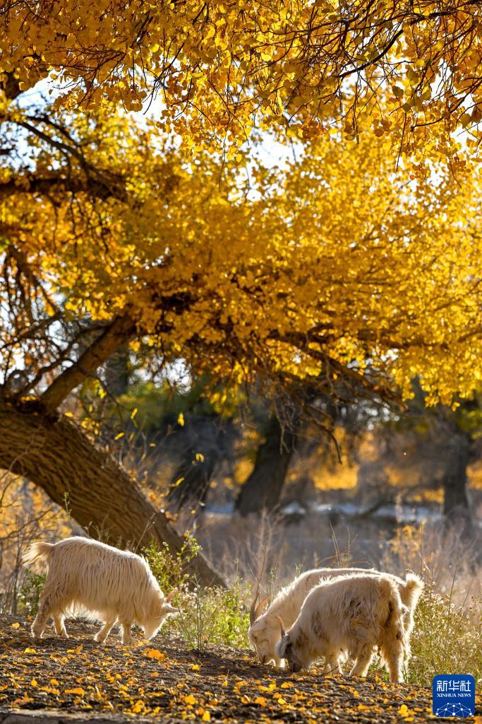 10月24日,羊群在胡楊林里覓食。