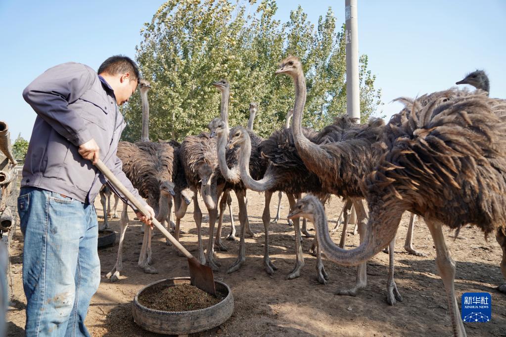 10月25日,辛集市小辛莊鄉小辛莊村辛南鴕鳥(niǎo)養殖園的工人在給鴕鳥(niǎo)喂食。