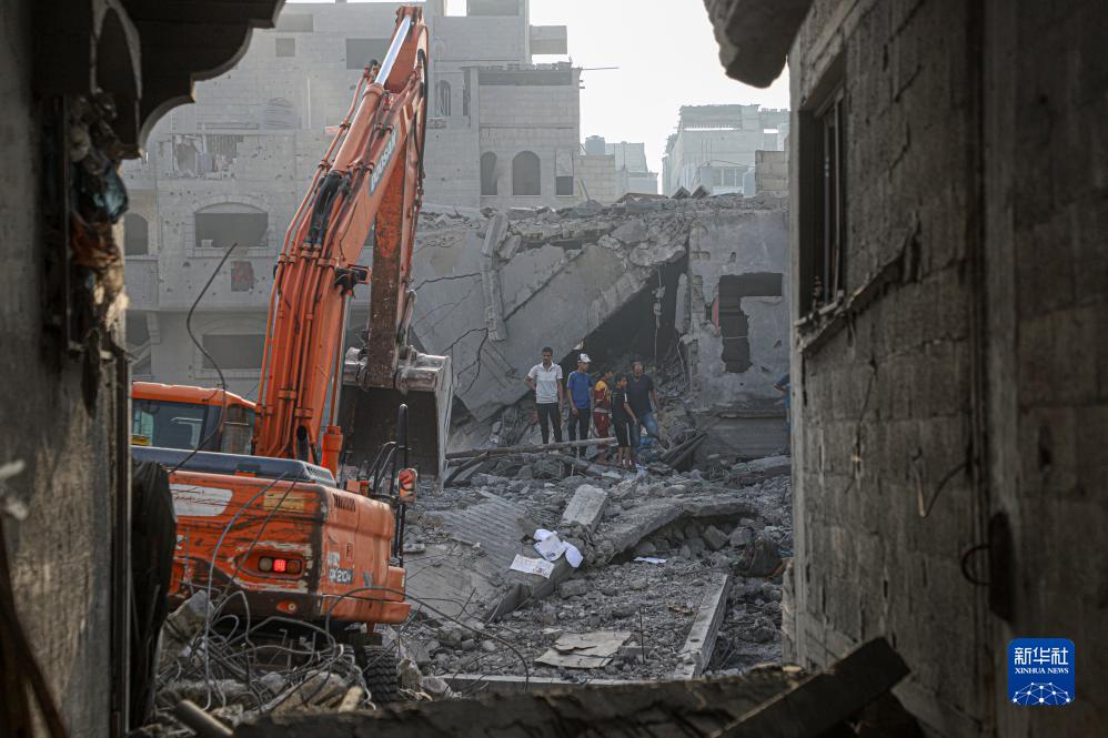 10月25日,在加沙地帶南部城市汗尤尼斯,挖掘機在以色列空襲后的建筑廢墟現場(chǎng)作業(yè)。