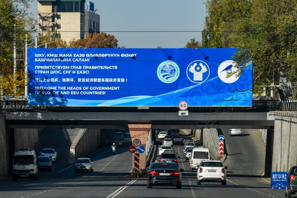 這是10月25日在吉爾吉斯斯坦首都比什凱克拍攝的上合組織標語(yǔ)。