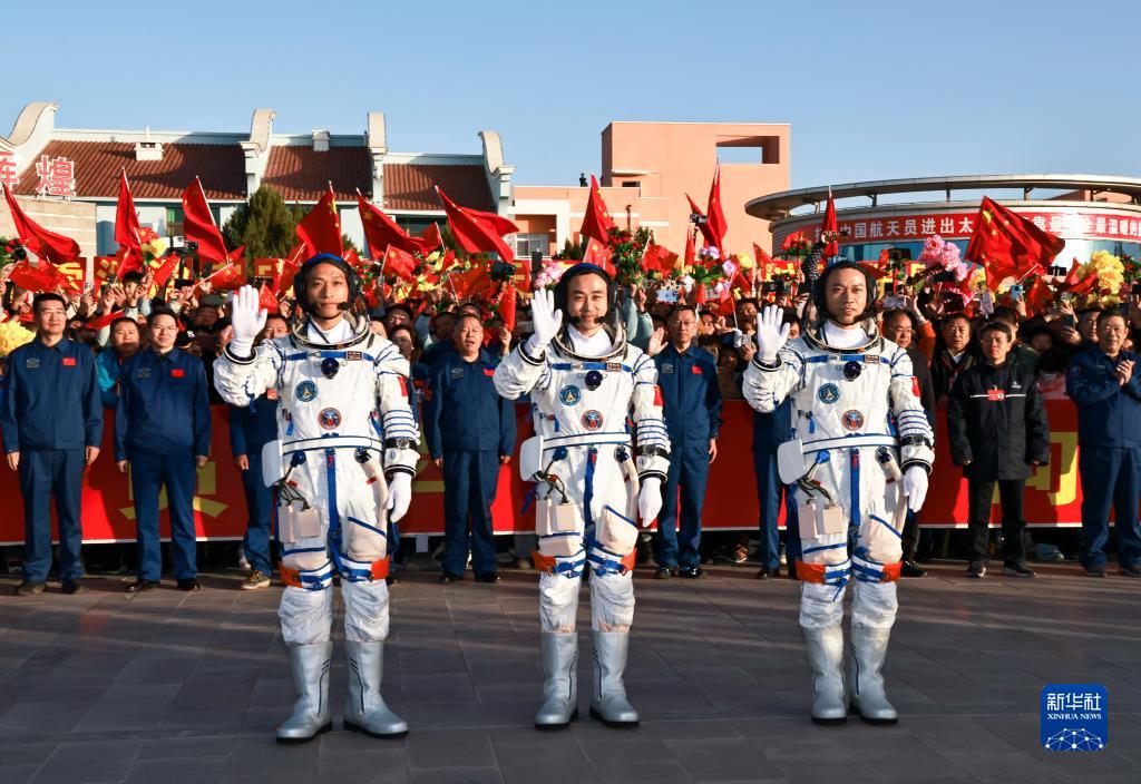 10月26日上午,神舟十七號載人飛行任務(wù)航天員乘組出征儀式在酒泉衛星發(fā)射中心問(wèn)天閣圓夢(mèng)園廣場(chǎng)舉行。這是航天員湯洪波(右)、唐勝杰(中)、江新林在出征儀式上。