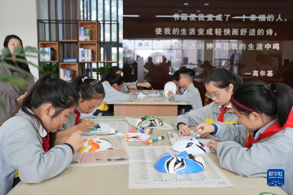 10月25日,在位于湖州市環(huán)渚街道的京劇服飾藝術(shù)館,湖師附小幸福里校區的小朋友用畫(huà)筆描繪京劇臉譜。