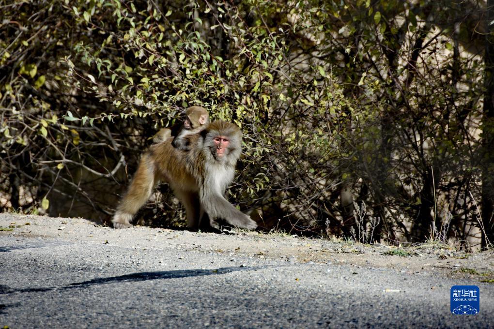一只藏獼猴背著(zhù)小猴子在公路旁行走(10月25日攝)。