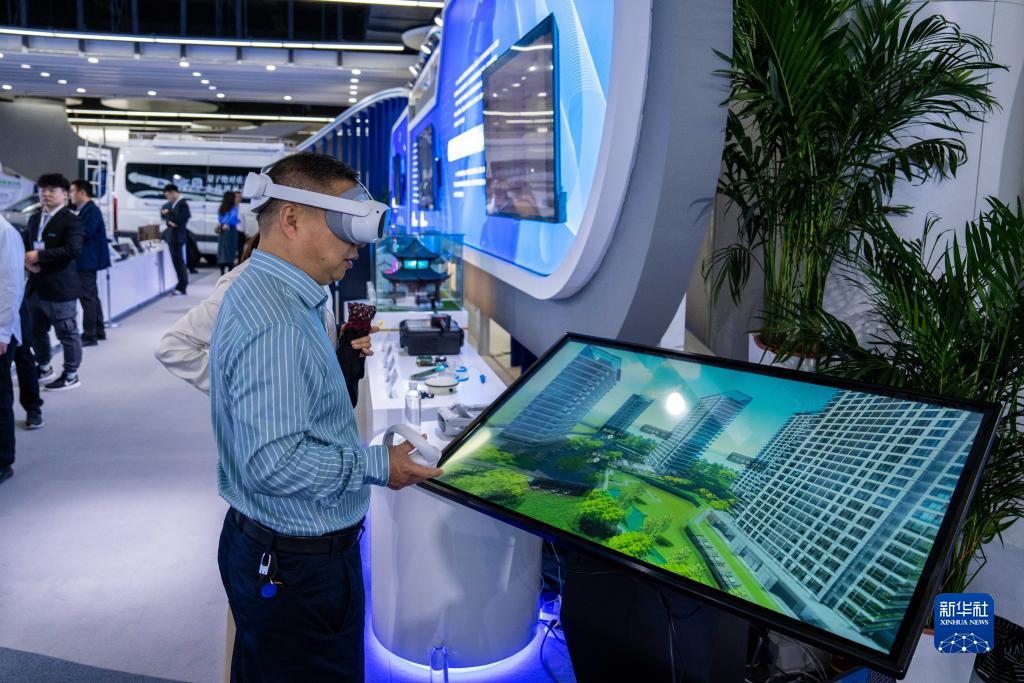 10月26日,在株洲國際會(huì )展中心,觀(guān)眾穿戴VR設備體驗利用北斗技術(shù)輔助建模的地圖仿真模型。