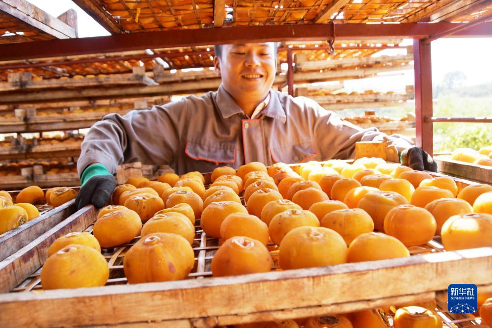 10月15日,廣西桂林市恭城瑤族自治縣嘉會(huì )鎮秧家村柿農在晾曬柿子。