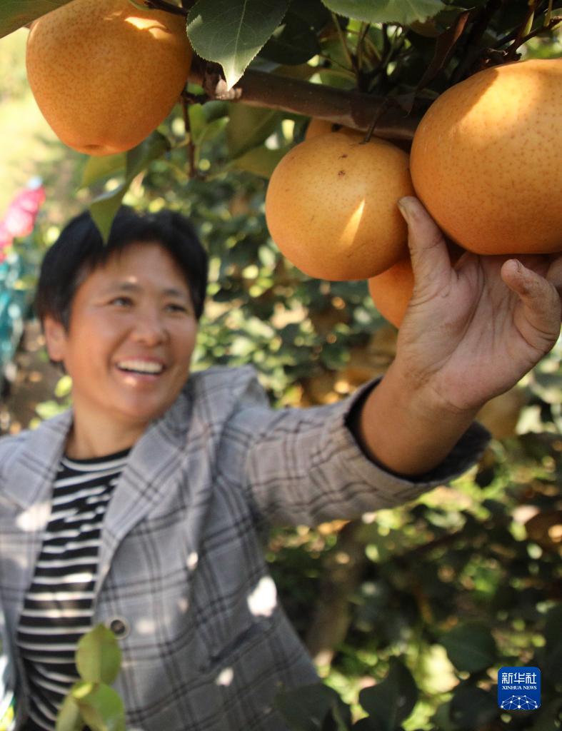 10月9日,在河北省邯鄲市廣平縣平固店鎮南下堡村晚秋黃梨種植基地,農戶(hù)在采摘成熟的晚秋黃梨。