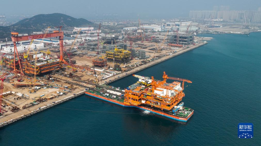 10月26日在青島建造現場(chǎng)拍攝的埕北油田中心平臺(無(wú)人機照片)。平臺裝船后將赴渤海西部海域,進(jìn)入海上安裝和調試階段。