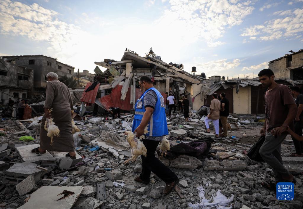 10月27日,在加沙地帶南部城市汗尤尼斯,人們經(jīng)過(guò)以軍襲擊后的房屋廢墟。
