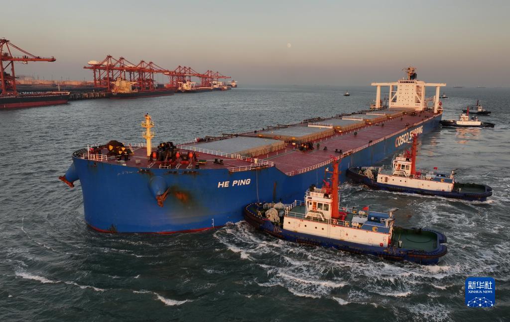 10月27日,一艘輪船在拖輪的協(xié)助下向唐山港曹妃甸港區礦石碼頭靠泊(無(wú)人機照片)。