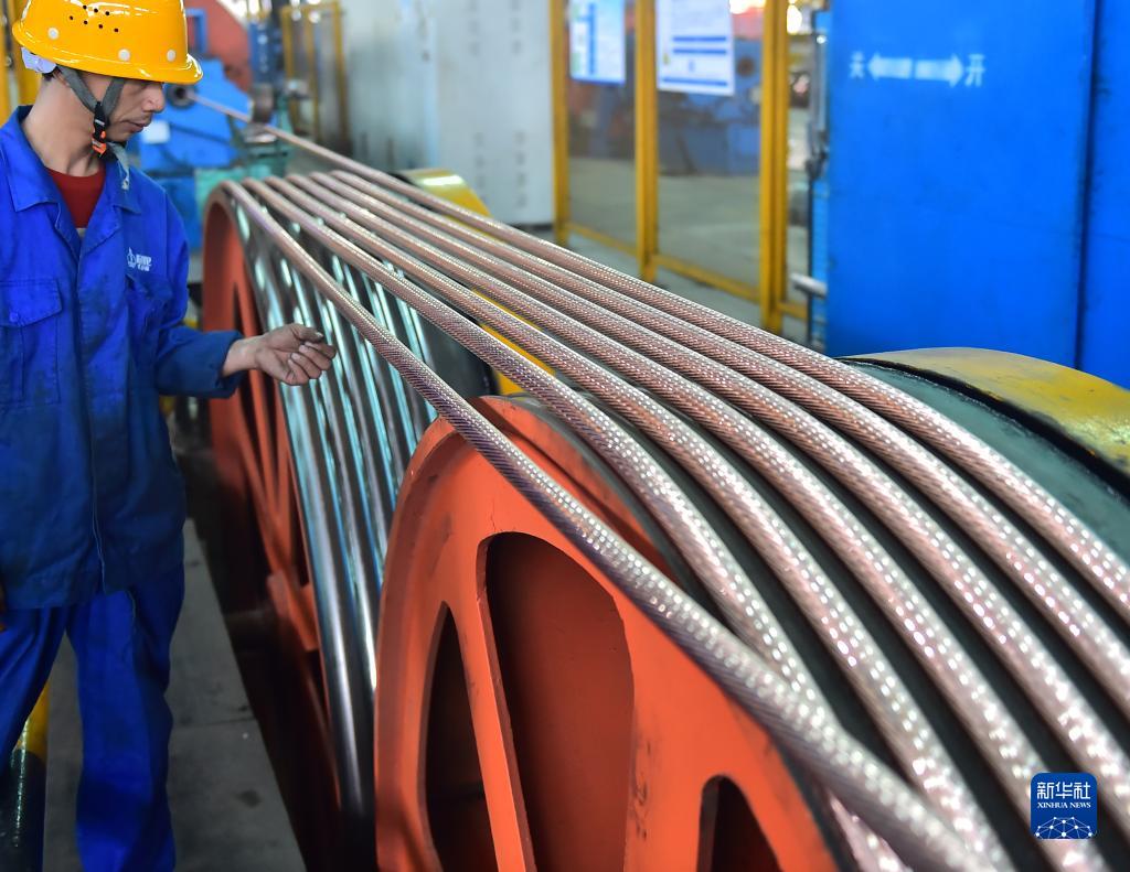 10月27日,技術(shù)工人在山東省聊城市陽(yáng)谷縣漢河(陽(yáng)谷)電纜有限公司生產(chǎn)車(chē)間電纜生產(chǎn)線(xiàn)上值守。