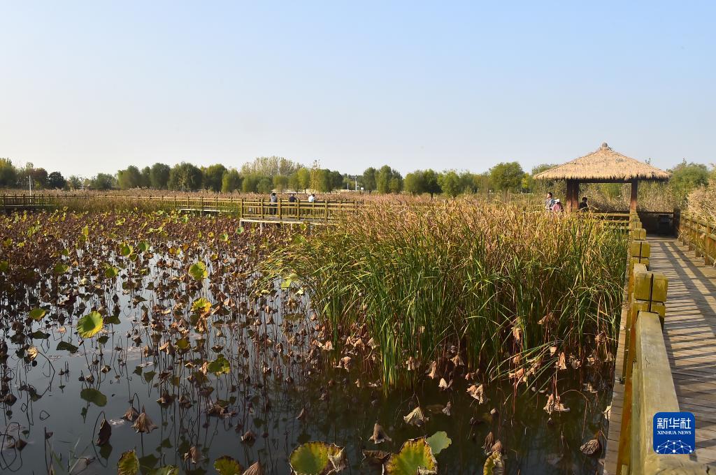 10月26日在山東省聊城市位山灌區拍攝的在引黃工程沉淀池區開(kāi)發(fā)的位山黃河公園一角。位山灌區是黃河流域具有跨流域調水和生態(tài)保護功能的重要水利設施。