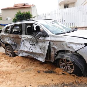 這是10月29日在以色列南部城市阿什杜德拍攝的遭火箭彈襲擊的車(chē)輛。