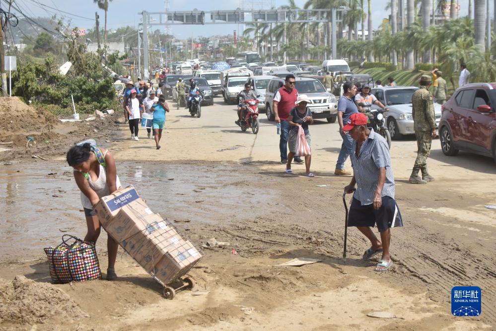 10月28日,在墨西哥格雷羅州阿卡普爾科,人們走在被洪水損壞的道路上。