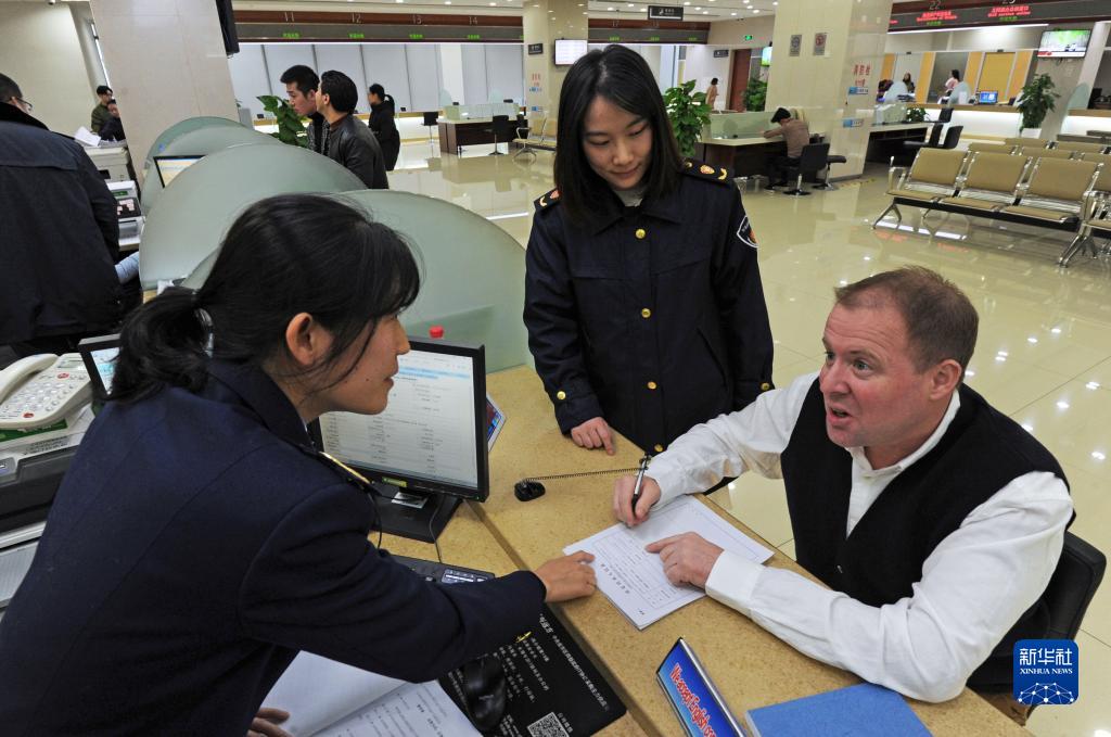 2019年11月29日,在浙江省義烏市國際貿易服務(wù)中心辦事大廳,工作人員在為英國商人泰山(右)提供外貿咨詢(xún)服務(wù)。近年來(lái),義烏推出一系列“當天申請、當天辦結”的辦事措施,以高效便利的服務(wù)優(yōu)化涉外營(yíng)商環(huán)境。