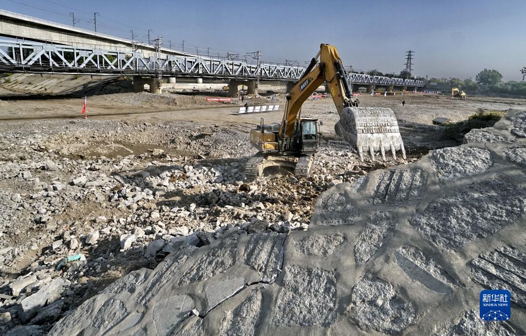 10月30日,施工人員在永定河河道內清理水毀水利設施。