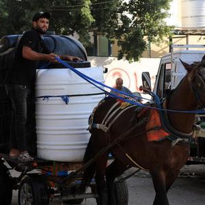 10月30日,因缺乏燃料,人們在加沙地帶南部城市汗尤尼斯使用畜力車(chē)運輸飲用水。