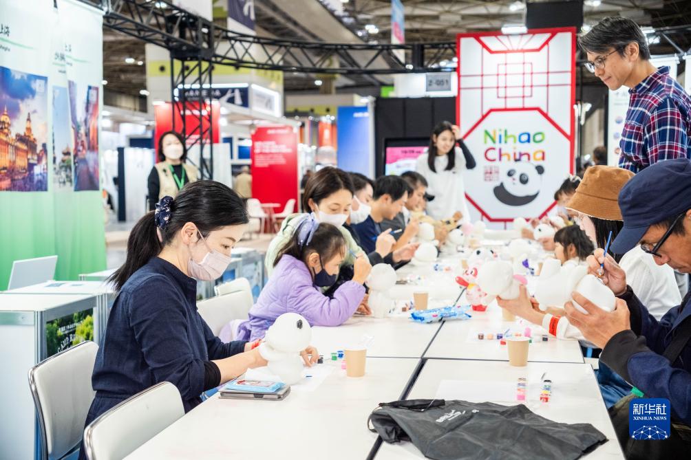 10月29日,游客在日本大阪國際會(huì )展中心中國館體驗為熊貓玩偶上色。