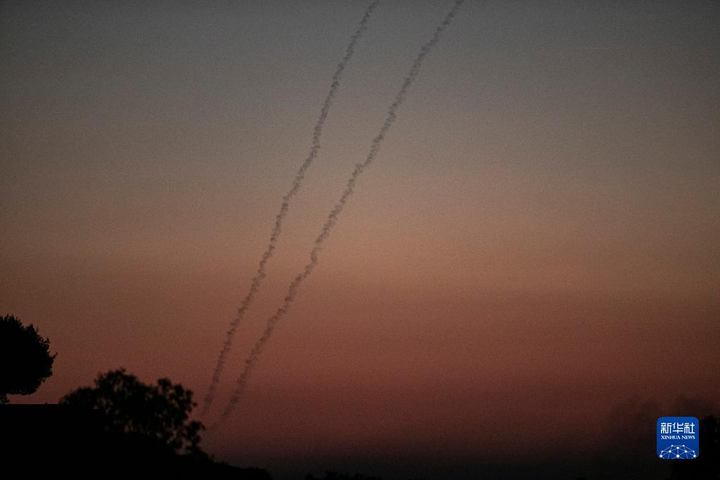 這張10月30日在加沙邊境以色列一側拍攝的照片顯示,從加沙地帶發(fā)射的火箭彈在空中留下煙軌。