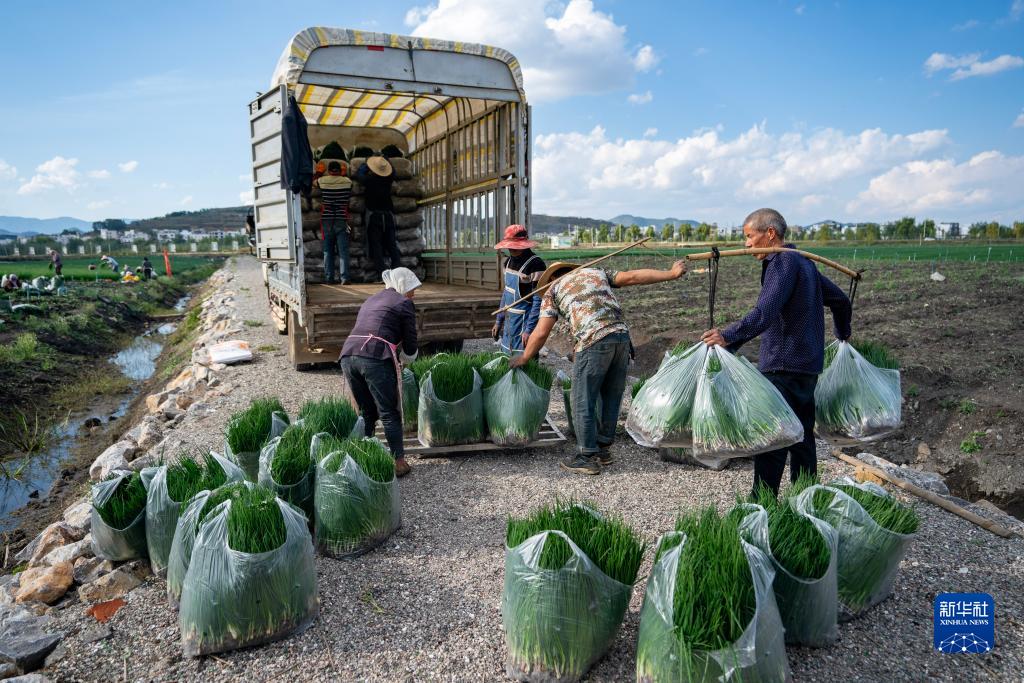 10月30日,農民在魯甸縣一處香蔥種植基地內將香蔥稱(chēng)重裝車(chē)。