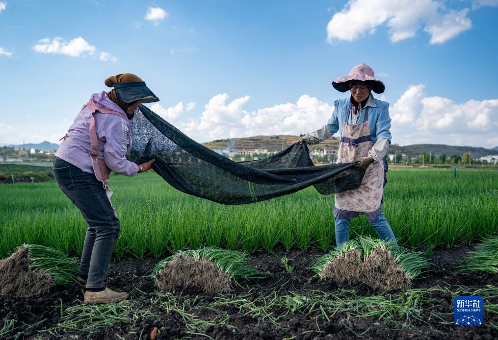 10月30日,農民在魯甸縣一處香蔥種植基地內為剛采收的香蔥蓋遮陽(yáng)布。