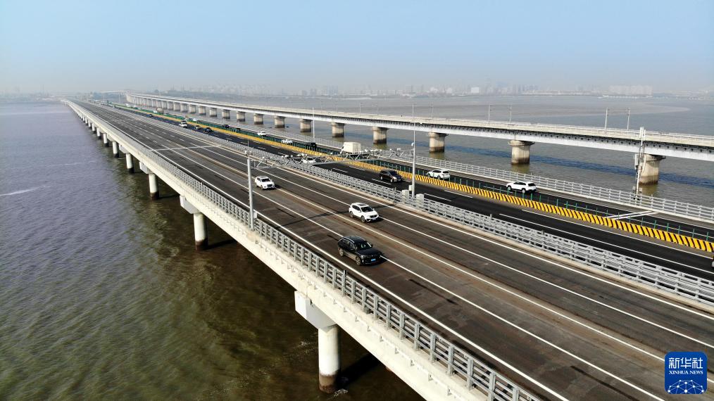 車(chē)輛從青蘭高速女姑口跨海特大橋上駛過(guò)(10月31日攝,無(wú)人機照片)。